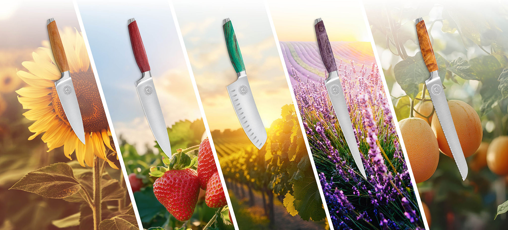 Fine-grained wood handles are infused with Provençal hues - golden sunflower, fragrant lavender, ripe berry, sun-warmed melon and lush vineyard green - making every knife one of a kind.