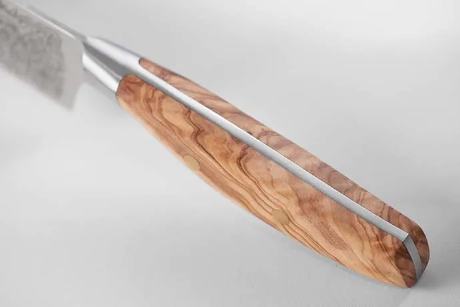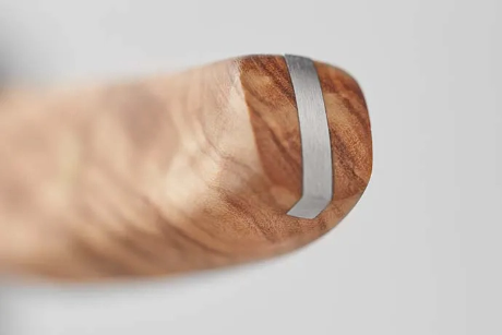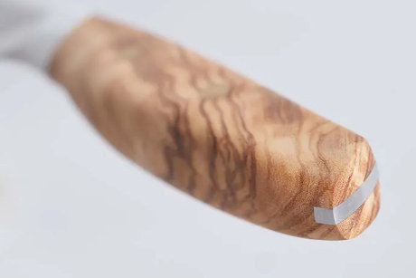 Every Amici 1814 chef’s knife is unique. The elegant, distinct grain of Calabrian olive wood creates an individual pattern on each knife, meaning no two handles are the same. Olive trees are slow growing, with strong wood that is naturally water-repellent and antibacterial.