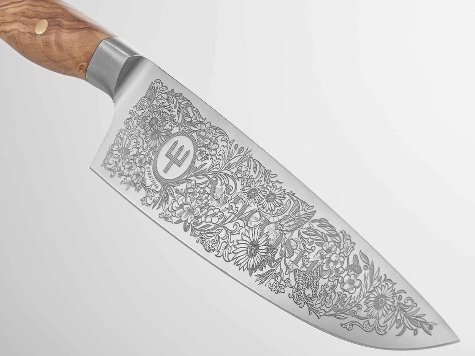 The stunning artwork on the stainless-steel blade was created in collaboration with Dario Cortini, a virtuoso Italian artist and one of the world’s few master engravers. Cortini spearheaded the knife’s art direction at the internationally famous Bottega Incisioni C. Giovanelli in Brescia, Italy, which for over 60 years has been a workshop, school, and point of origin for master engravers across the globe. The result is breathtakingly beautiful: this unique knife is at once a collector’s item, a work of art for the senses, and a workhorse for carving, slicing, and dicing in your kitchen.